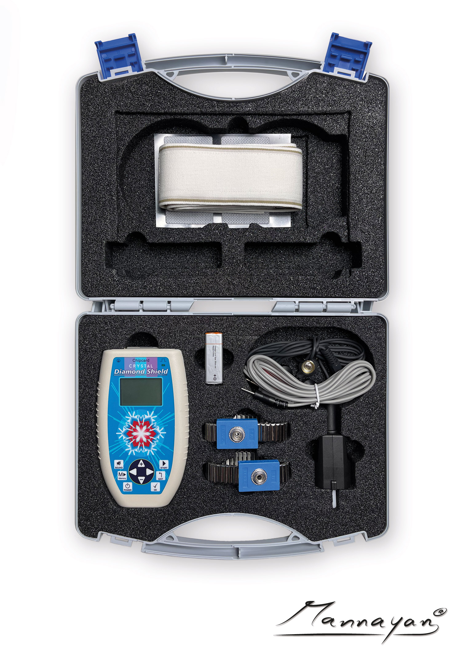 | Lieferumfang: | 1x Chipkarte BiBlo, 1x Chipkarte DTX, 2 Klebeelektroden 80 x 45 mm, 9V Blockakku und Ladegerät, Diamond Shield Crystal Zapper, Elektrodengürtel für die Anwendung des Crystal Programms, Elektrodenkabel, Erdungskabel (Stecker Typ F, "Schuko"), Kunststoffkoffer, Metall-Armbandmanschetten, Steckdosentester |