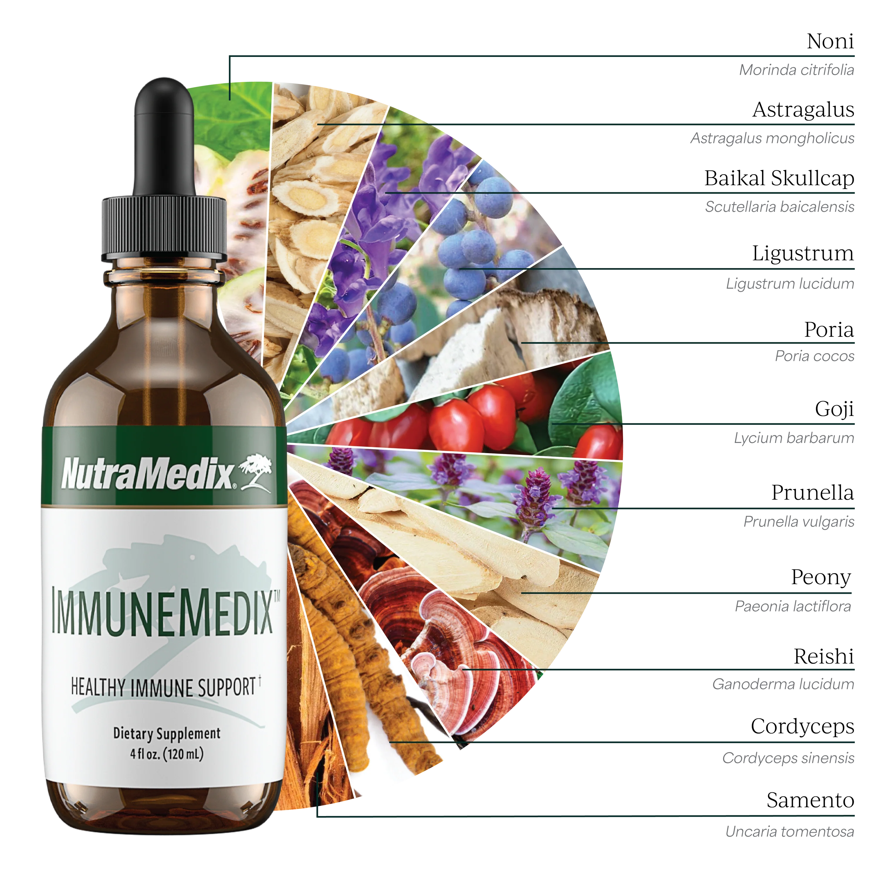 Noni fruit extract (Morinda citrifolia), astragalus root (Astragalus mongholicus), Baikal skullcap root (Scutellaria baicalensis), glossy privet fruit (Ligustrum lucidum), Poria cocos mushroom (Poria sclerotium), goji berry (Lycium barbarum), small brownwort (Prunella vulgaris), white peony root (Paeonia lactiflora), reishi mushroom (Ganoderma lucidum), cordyceps mushroom (Cordyceps sinensis), and pentacyclic cat's claw bark (Uncaria tomentosa, Samento) Other ingredients: mineral water, extraction agent ethanol (20-24%)